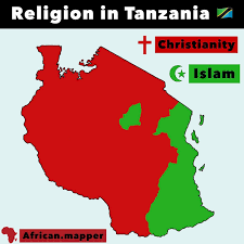 The diagram displays the distribution of religion in the country, showing that most coastal regions are Muslim, and most inland areas are largely Christian. One may hypothesize that the stickers and sayings at the back of the Bajajis and Daladalas in the Christian areas of Tanzania may reflect Christian sayings and Bible verses, and Vice Versa with Islam.