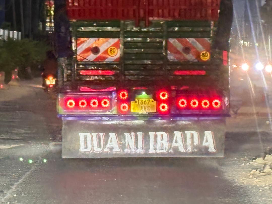 The back of the truck in the image displays the saying “Dua Ni Ibada” in bold, capital, white painted letters. Usually, the stickers and letters on the backs of the trucks are large and eye-catching, most of the time in contrasting colors and capital letters. This saying is a religious one, meaning “supplication is worship.” A saying like this bears a deeper meaning, spreading the message that faith becomes a source of reassurance, and turning to god is not an act of faith itself, but also a way to navigate life.